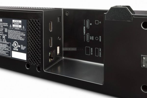 A hangrúd hátoldala a szokásos recept szerint készült, mivel egy kis bemélyedésben helyezték el az összes csatlakozót, a hálózati tápaljzattal együtt. Minden lényeges csatlakozó megtalálható rajta, így HDMI be- és kimenet, analóg audio bemenet, valamint digitális optikai bemenet továbbá Ethernet aljzat. Legfeljebb csak az adhat okot reklamációra, hogy mindössze egy bemenetként szolgáló HDMI csatlakozó kapott rajta helyet, míg a másik direkt kimenet a televízióhoz. A HDMI a két alap kényelmi funkciót ismeri, így az ARC és a CEC is működik vele, ami a hangerő vezérlést kényelmesebbé teszi, és főleg megspórol egy távvezérlőt.
