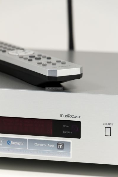 Előlapján minimális eszköztár gondoskodik arról, hogy a szép szálcsiszolt alumínium felületet ne csúfítsa el túl sok gomb vagy tekerentyű. Jobbról balra haladva találjuk a megszokott vezérlőtárcsát, egy a MusicCast applikáció csatlakozáshoz való gombot, egy funkció választót, majd a pontmátrix kijelzőt követően az USB aljzatot és a készléti kapcsolót. Ez utóbbit optimális esetben csak egyszer kell benyomnunk.