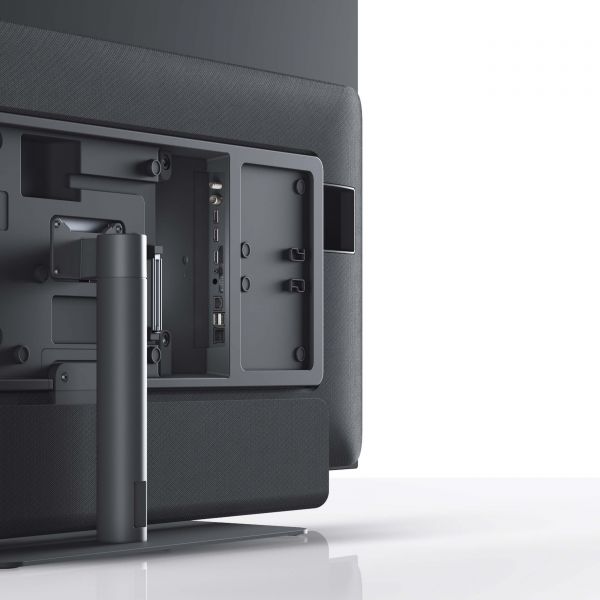 Lehet, hogy szemből lapos, de hátulról kifejezetten guszta látvány - igen, a tévéről van szó. Az elektronikát tartalmazó, vastagabb részt szövettel vonták be, a csatlakozók és kábelek pedig teljesen elrejthetők a mágnesesen rögzíthető takarólemezek segítségével. Ez látszólag elhanyagolható extra, de egy olyan esztétikus környezetben, ahol cél a letisztultság fenntartása, számottevő lehet.