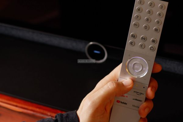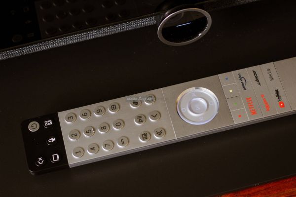 Az infravörös távvezérlő nagyobb, nehezebb és minőségibb érzetet nyújtott a megszokottakhoz képest. Szellős gombkiosztása, alumínium teteje egyértelműen hozzátettek a prémium élményhez. A lejátszás gombot hosszan nyomva rejtett háttérvilágítást kapott a középső navigációs szakasz, ami kellemes gesztusként hatott. Tovább fokozta volna az élményt az infravörös jel helyett egyéb vezetéknélküli kommunikáció (esetleg Bluetooth) használata. Ám így sem panaszkodhatunk a tv "érzékenységét" illetően, sok szögből azonnal reagált a távvezérlő parancsaira, nem kellett közlekedési rendőrt játszanunk, sokszor még úgy is reagált a készülék, hogy háttal álltunk neki.